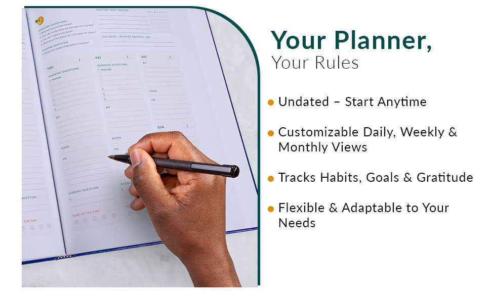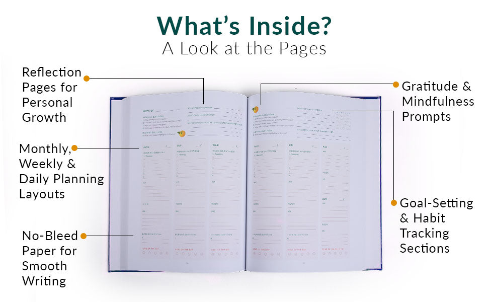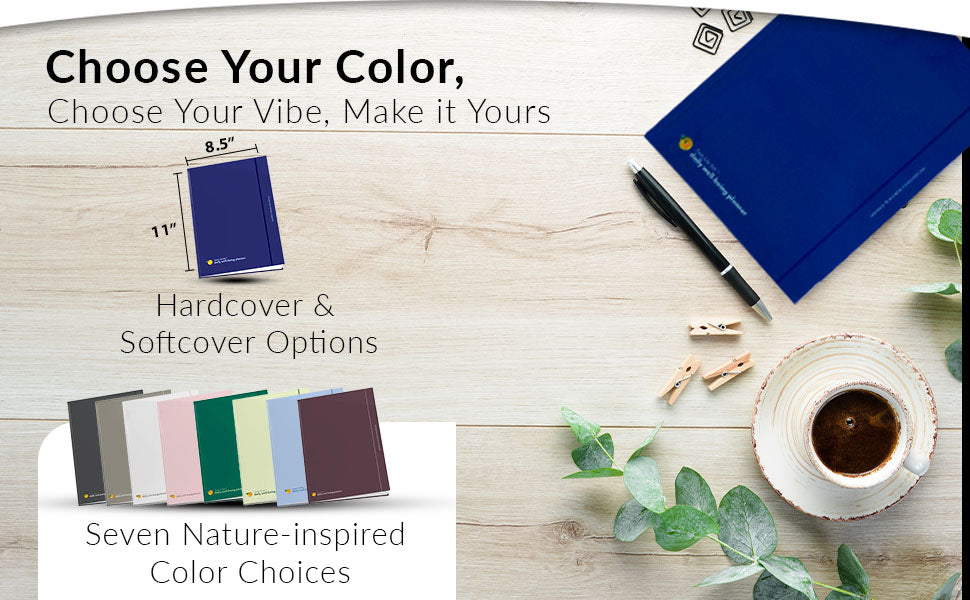 Our planner encourages you to gently weave more positive actions into your daily routines with research-backed strategies like goal-setting and habit formation. To make the most of your journey, we encourage you to check in with yourself on your progress regularly. In addition, incorporating reflective writing into your day and establishing a regular habit of expressing gratitude can profoundly shift your mindset and well-being.