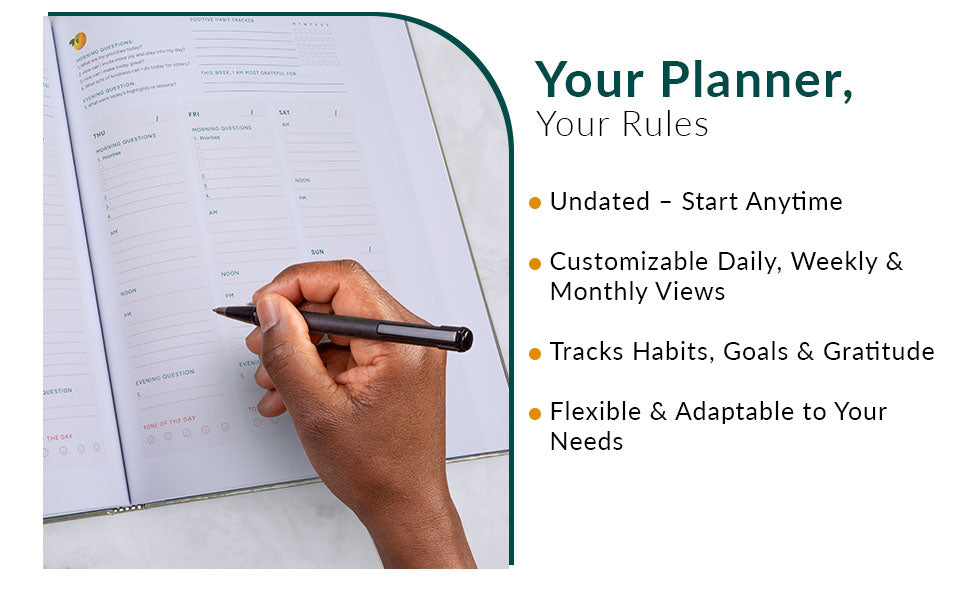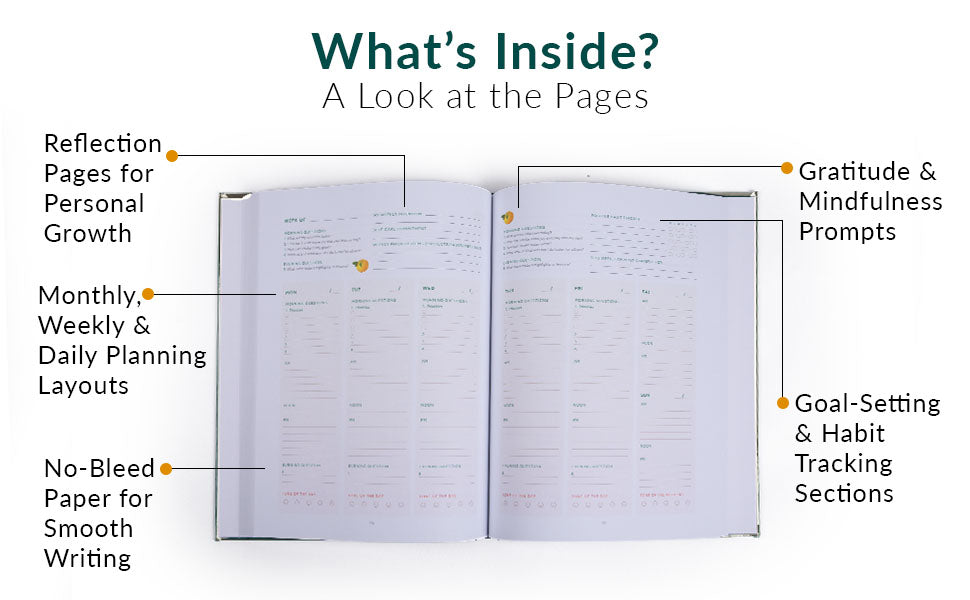 Our planner encourages you to gently weave more positive actions into your daily routines with research-backed strategies like goal-setting and habit formation. To make the most of your journey, we encourage you to check in with yourself on your progress regularly. In addition, incorporating reflective writing into your day and establishing a regular habit of expressing gratitude can profoundly shift your mindset and well-being.