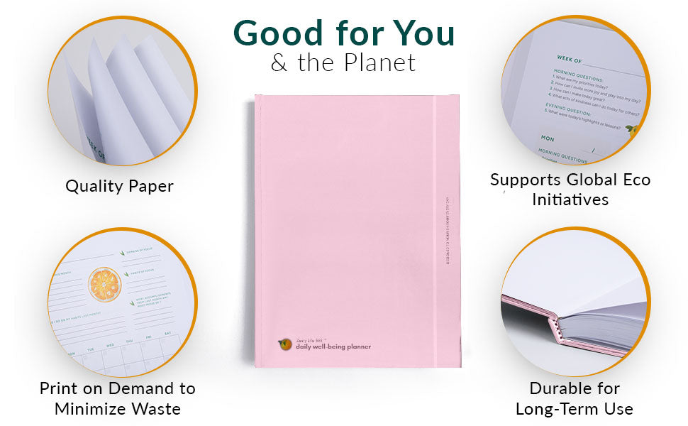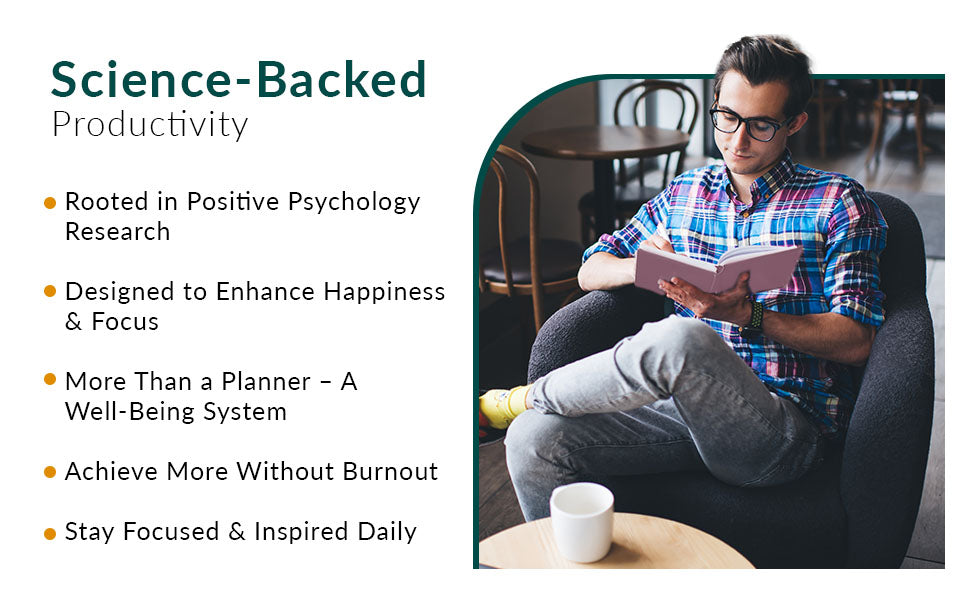 Our planner encourages you to gently weave more positive actions into your daily routine with research-backed strategies like goal-setting and habit formation. To make the most of your journey, we encourage you to check in with yourself on your progress regularly. Incorporating reflective writing into your day and establishing a regular habit of expressing gratitude can profoundly shift your mindset and well-being.